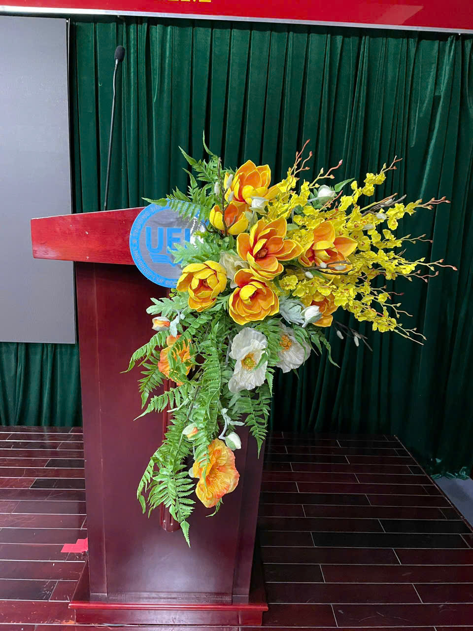 Bục phát biểu là nơi đại diện phát ngôn của sự kiện. Hoa trang trí tại đây cần hài hòa, không che khuất tầm nhìn nhưng vẫn nổi bật và sang trọng. Midori cung cấp các mẫu hoa vải được thiết kế thủ công, sử dụng màu sắc trang nhã như đỏ đô, trắng sứ, xanh cổ điển – vừa phù hợp với các lễ truyền thống vừa tạo sự mới mẻ trong các sự kiện hiện đại. Sự phối hợp giữa hoa và chất liệu lụa cao cấp giúp tổng thể bục phát biểu trở nên chuyên nghiệp và thu hút.