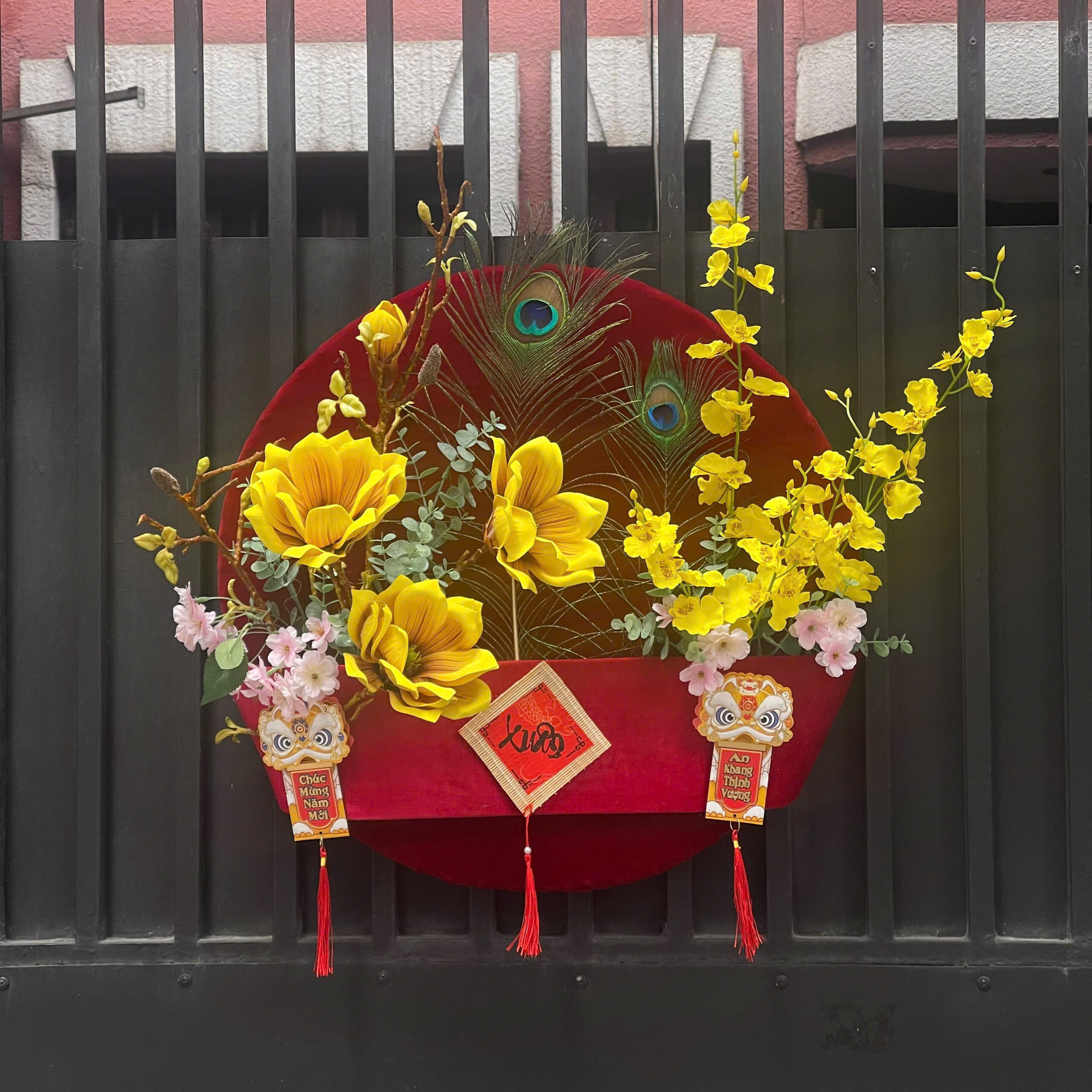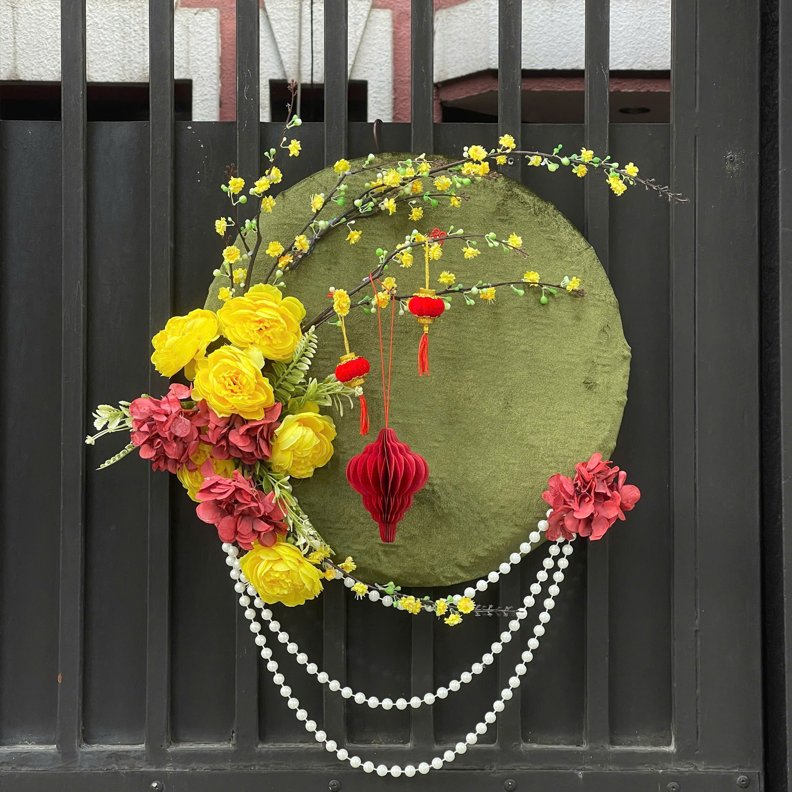 Hoa mai vàng tượng trưng cho phú quý, tài lộc và may mắn. Nia tròn kết hợp hoa mai vải, nụ non và cành uốn cong mềm mại mang đến cảm giác xuân phương Nam rõ nét, rất phù hợp treo trước cửa nhà hoặc cửa hàng.